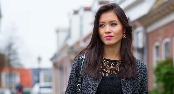 In de outfit voor vandaag combineer ik een barock broek en top met een grijs vest met panter print. Om de look een extra touch te geven draag ik knalroze lipstick. Dit maakt het een stoere classy outfit!