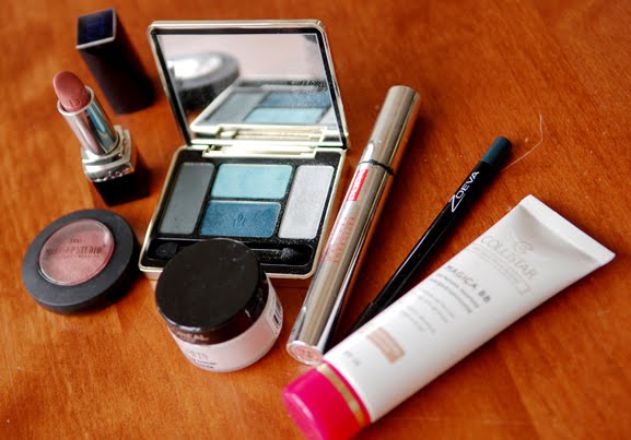 Ik mix een blauwe oogschaduwkleur met zilver/zwart en hierdoor springen mijn ogen er extra goed uit. Ik gebruik hiervoor het oogschaduwpalette van Guerlain ‘Les Aqua’. Ik heb, onder en boven mijn wimperrand, met het Zoeva kohl potlood een lijntje getrokken . (deze komt trouwens uit de Glossybox van maand mei 2012) Dit is een waterproof eyeliner. Op mijn gezicht draag ik de BB cream van Collistar.