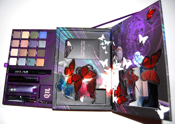 Als je het palette open doet zie je onmiddellijk dat de vlinders zich aan de binnenkant ook voortzetten. Het palette bestaat uit een grappige combinatie van 16 kleuren oogschaduw, een liquid liner en mascara, een mini versie van Urban Decay’s primer potion, en een USB cable, telefoonspeaker en vier tutorials die je via de speciale QR codes op je telefoon kunt afspelen. In het palette zit zelfs een uitsparing waar je je telefoon in kunt zetten, zodat je tijdens het opmaken muziek kunt luisteren of de tutorials af kunt spelen.